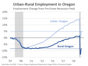 On the one hand, as recently detailed by the Oregon Office of Economic Analysis, rural Oregon—including the Coast—has lost a smaller share of jobs than urban Oregon since the start of the COVID-19 pandemic. On the other, as shown in the chart below (left), prior to the onset of the pandemic, rural Oregon had barely regained the level of jobs prior to the “Great Recession” of 2007-2009—continuing a troubling pattern of lagging economic growth. The effects of this geographic inequality go far beyond economics, affecting everything from life expectancy to access to health insurance, as shown below (right).